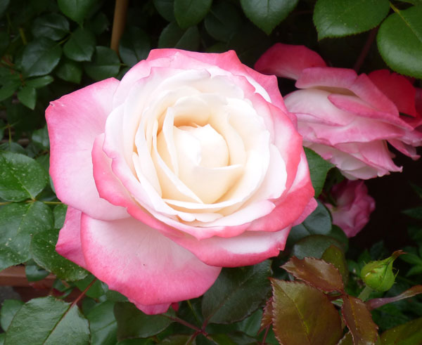 Ein wunderschönes Farbenspiel macht diese Rose einzigartig. Ihre Blüten zeigen eine Komposition von cremeweißem Inneren mit kirschrosa Rand. Die gut gefüllten Blüten öffnen sich ballförmig und verströmen einen charismatischen Duft. 'Nostalgie' ® ist geeignet sowohl für Rosen- und Blumenbeete als auch für Kübel und als Schnittrose. Sie ist eine sehr blühfreudige und hitzeverträgliche Sorte mit buschigem Wuchs und kräftigem Laub. 'Nostalgie' ® wird etwa 70 bis 120 cm hoch und blüht von Juni bis Oktober. Die Edelrose sollte sonnig bis halbschattig auf humosem Gartenboden stehen.