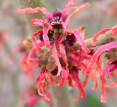Gärten in der kalten Jahreszeit. Die Zaubernuss ´Feuerzauber´ blüht